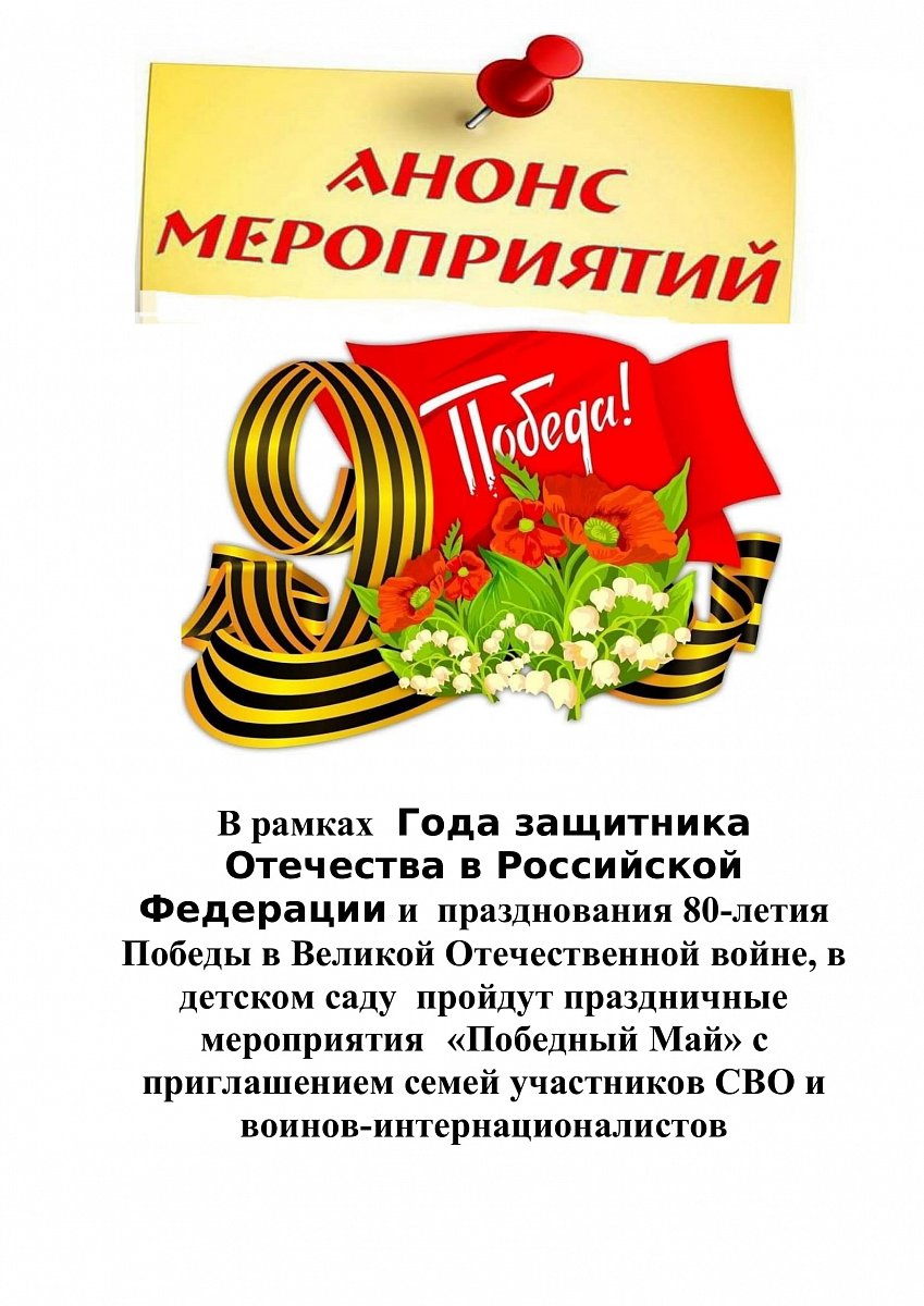 В рамках Года защитника Отечества в Российской Федерации и празднования 80-летия Победы в Великой Отечественной войне, в детском саду пройдут праздничные мероприятия «Победный Май» с приглашением семей участников СВО и воинов-интернационалистов.