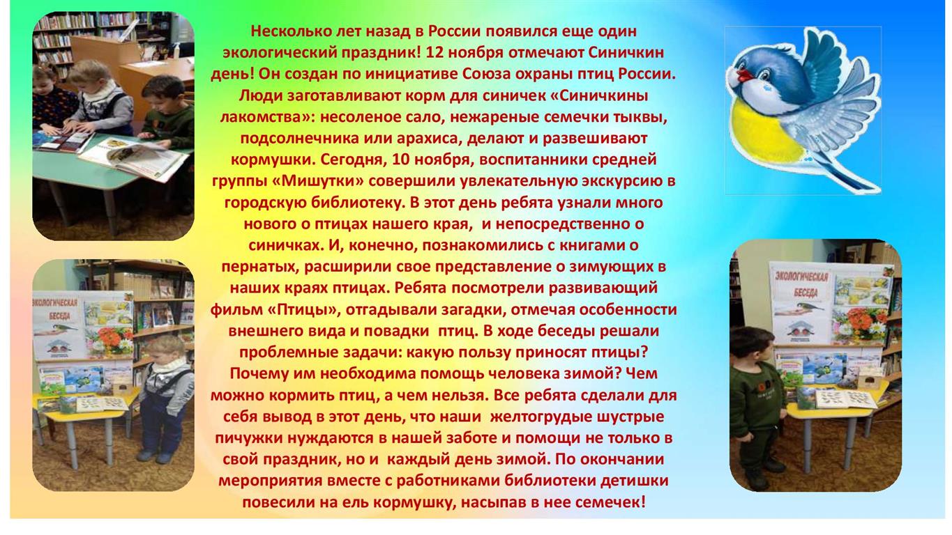 Люди заготавливают корм для синичек «Синичкины лакомства»: несоленое сало, нежареные семечки тыквы, подсолнечника или арахиса, делают и развешивают кормушки. Сегодня, 10 ноября, воспитанники средней группы «Мишутки» совершили увлекательную экскурсию в городскую библиотеку. В этот день ребята узнали много нового о птицах нашего края, и непосредственно о синичках. И, конечно, познакомились с книгами о пернатых, расширили свое представление о зимующих в наших краях птицах. Ребята посмотрели развивающий фильм «Птицы», отгадывали загадки, отмечая особенности внешнего вида и повадки птиц.