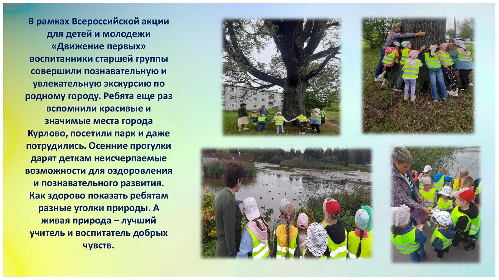 В рамках Всероссийской акции для детей и молодежи «Движение первых» воспитанники старшей группы совершили познавательную и увлекательную экскурсию по родному городу. Ребята еще раз вспомнили красивые и значимые места города Курлово, посетили парк и даже потрудились. Осенние прогулки дарят деткам неисчерпаемые возможности для оздоровления и познавательного развития. Как здорово показать ребятам разные уголки природы. А живая природа – лучший учитель и воспитатель добрых чувств.