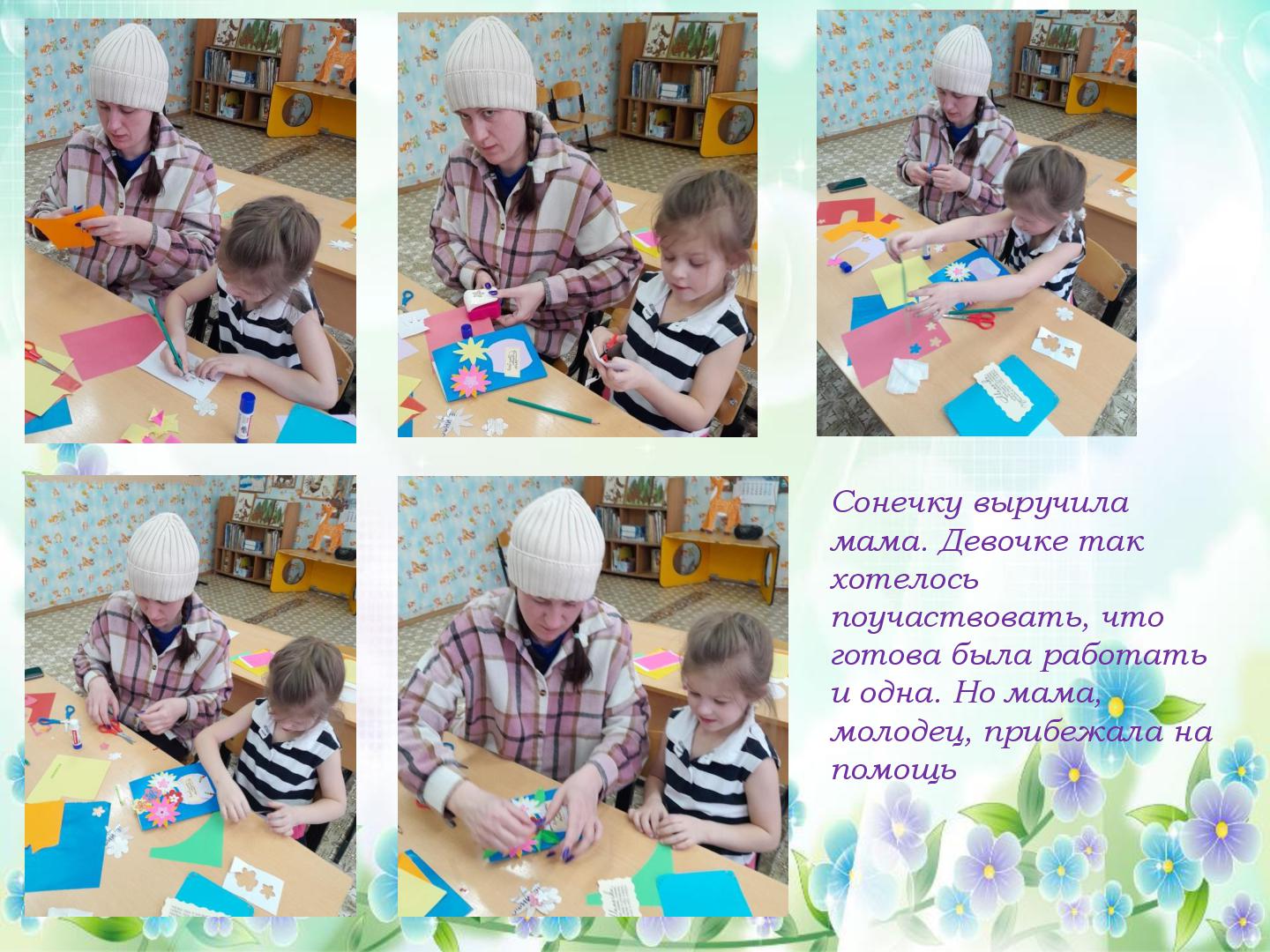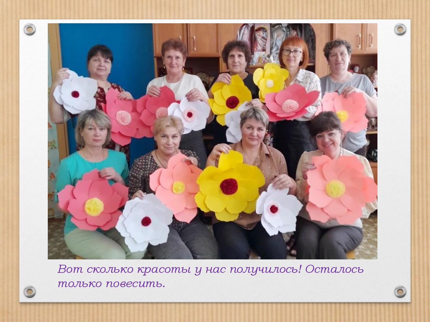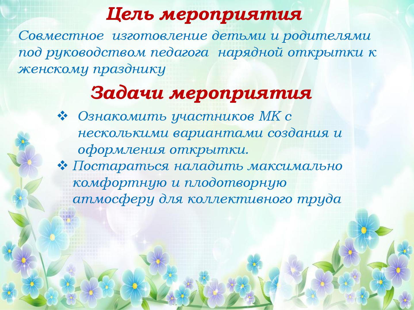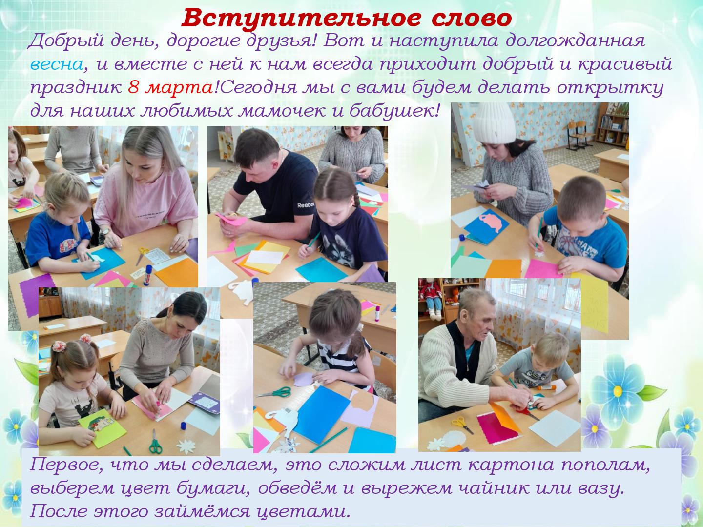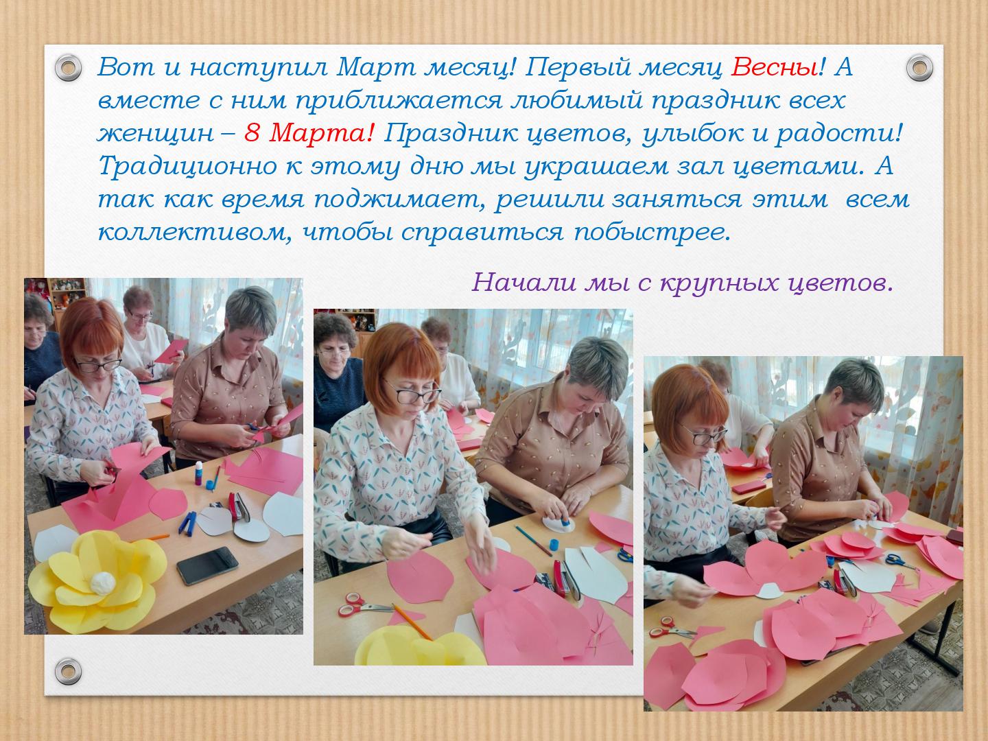 В преддверии Международного женского дня 8 марта в нашем саду прошли подготовительные работы к праздничным мероприятиям. Трудились все, и дети и педагоги. В старшей группе «Гномики» прошел мастер-класс по изготовлению поздравительной открытки для мамочки, бабушки, сестренки. Провела мастер-класс педагог ДО Кузянова Ольга Николаевна. Ну, а что же педагоги? Самое лучшее оформление для музыкального зала, сделанное своими руками. Вот и мы, воспитатели, постарались и сделали яркие, нежные, красивые цветы! К празднику мы готовы! С наступающим 8 марта!