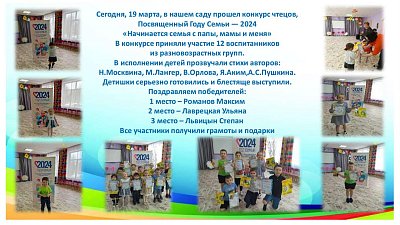 Сегодня, 19 марта, в нашем саду прошел конкурс чтецов, посвященный Году Семьи — 2024 «Начинается семья с папы, мамы и меня»