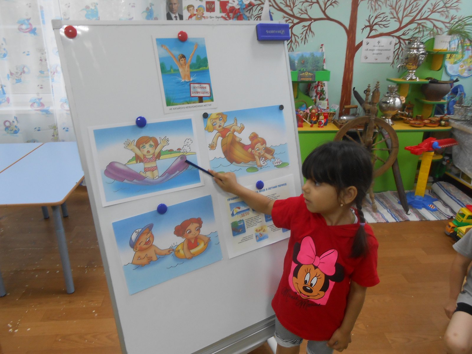 «Что мы знаем о воде?» «У воды играем – правила не забываем!» «Безопасное поведение на воде», в ходе которых дети закрепили правила нахождения у водных объектов и правила купания. Проводили опыты с водой: «Тонет – не тонет», «Мокрый - сухой»