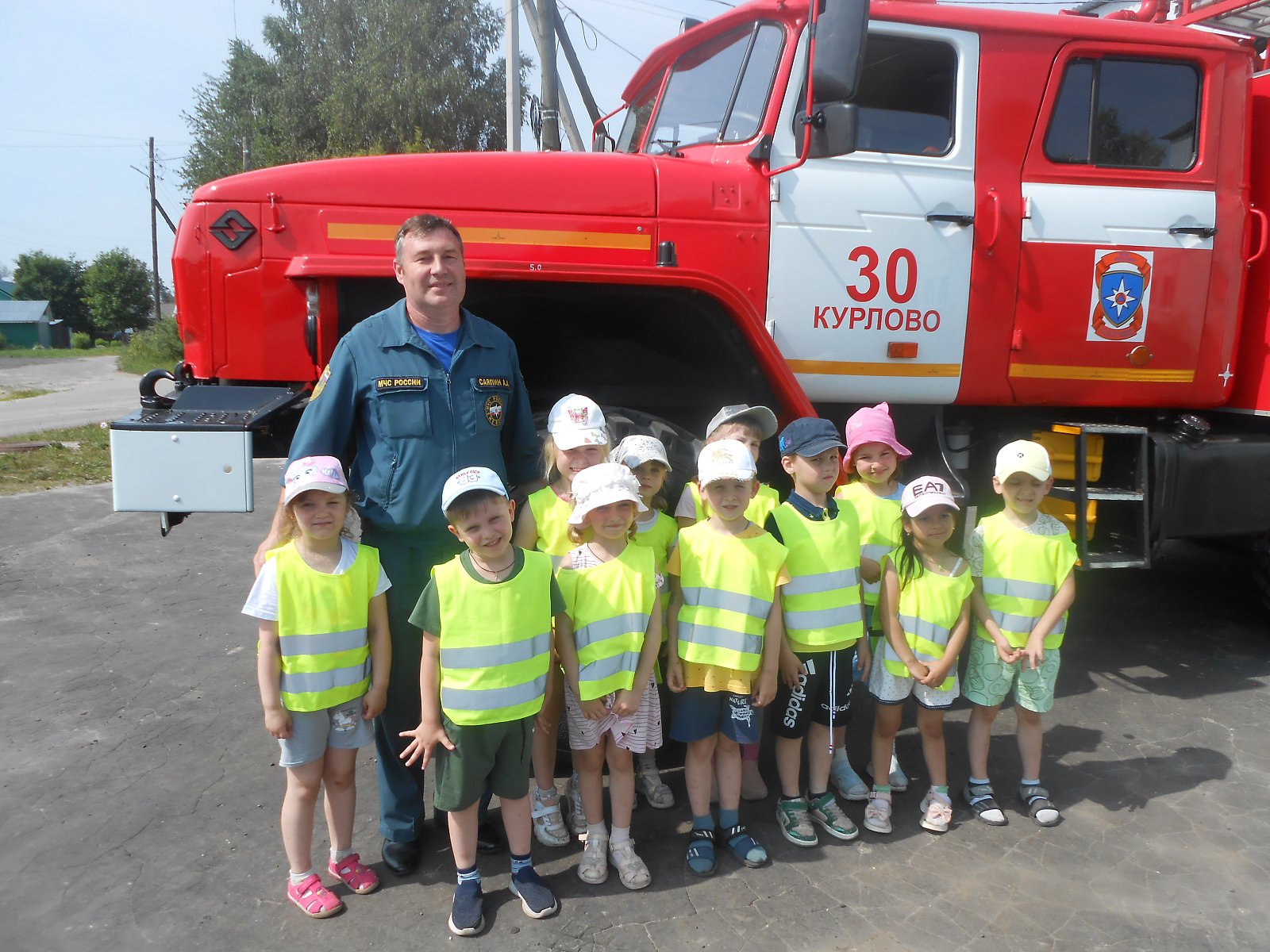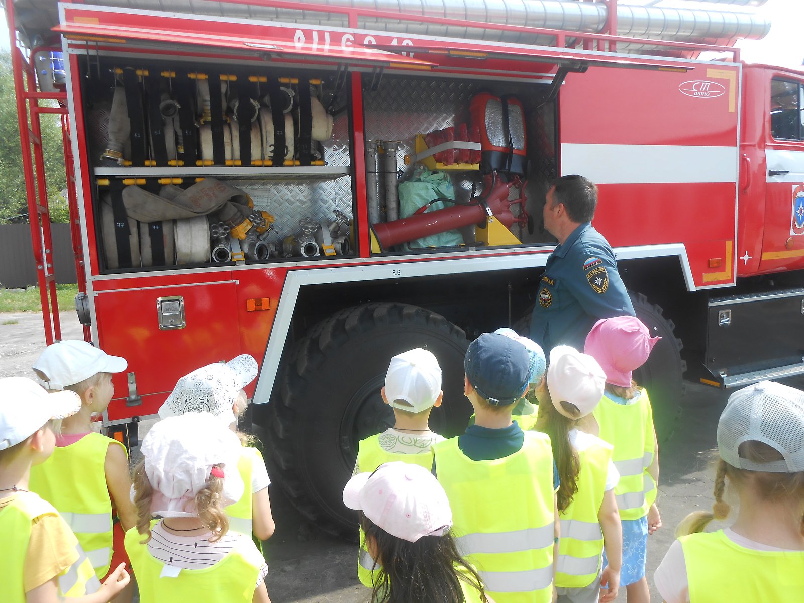 Сегодня, 1 июля, дети средней группы «Мишутки» побывали в гостях у пожарных. Встретил нас и провел познавательную экскурсию начальник пожарной части Саяпин А.А. Он рассказал детям о трудовых буднях пожарных, об оборудовании и обмундировании, о том, как отдыхают пожарные. Дети примерили на себя спец.одежду и каску. Алексей Алексеевич показал, как выглядит пожарная машина изнутри, где находится бак, который заполняется водой, какими приспособлениями пользуются пожарные. Как выглядят пожарные рукава и другие, столь нужные спасателям инструменты, необходимые при пожаре, рассказал об их назначении.