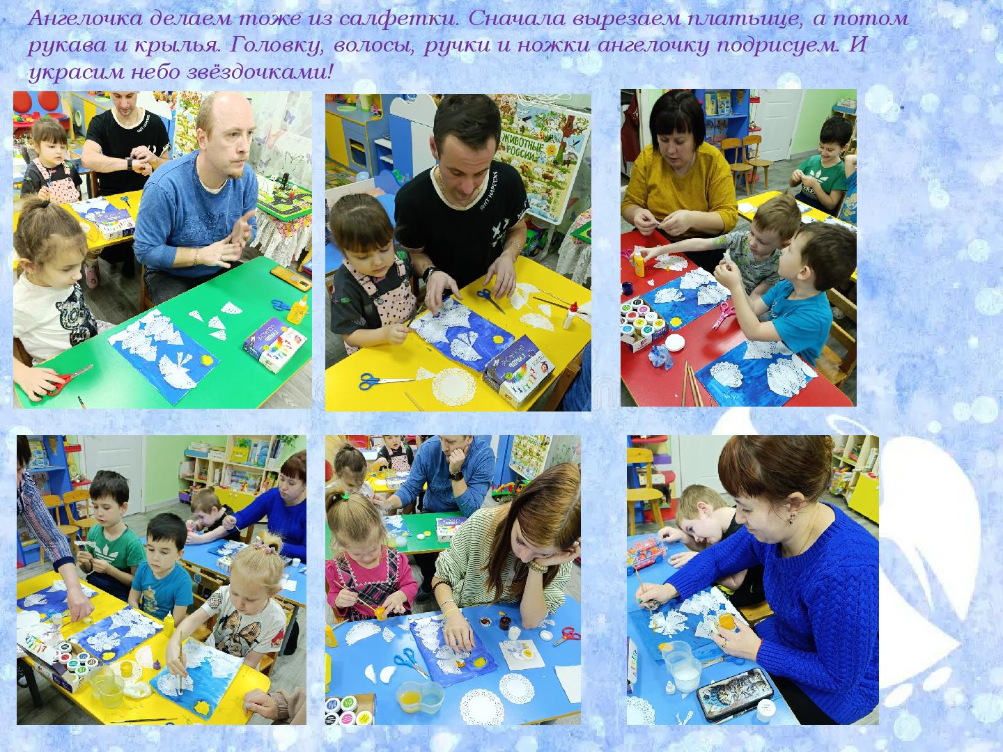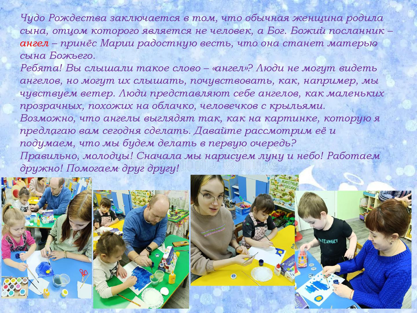Вчера, 16 января, на базе нашего детского сада прошел очередной мастер-класс с детьми и родителями средней группы «Капитошки» на тему «Рождественский ангел». Провела его, педагог дополнительного образования, Кузянова Ольга Николаевна. Она рассказала ребятам и родителям об истории праздника, его традициях и символах Рождества. Ангел - один из светлых символов Рождества. "Кто любит Бога, поступает по его воле, то есть имеет доброе сердце и помогает людям, к тому обязательно приходит Рождественский Ангел..." - эта истина о том, что добро обязательно возвращается к тому, кто его сделал.