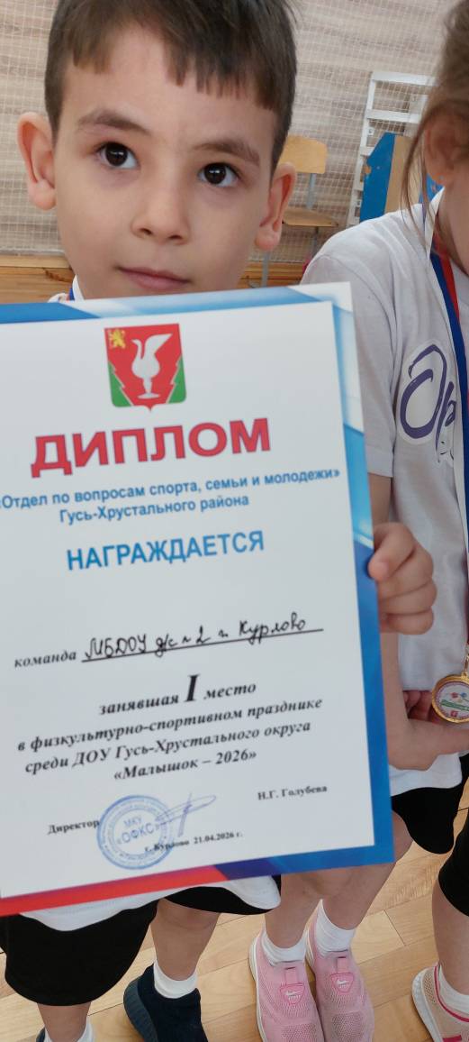 21 апреля 2026 года, на базе физкультурно-оздоровительного комплекса имени Ю.Н.Каперского, в городе Курлово, прошел ежегодный районный спортивный праздник «Малышок-26» среди воспитанников дошкольных учреждений. Цель этого мероприятия – формирование у детей дошкольного возраста культуры здоровья путем приобщения к здоровому образу жизни. В соревнованиях приняли участие воспитанники из 9 детских садов Гусь-Хрустального округа. Наш детский сад представляла сборная команда старших воспитанников «Орлята России». Дети соревновались в силе, ловкости, смекалке, быстроте, скорости. Чтобы показать свои физические качества наши маленькие спортсмены участвовали в таких эстафетах как: «Передай эстафетную палочку», «Челночный бег», «Передай мяч», «Спасательный круг, «Змейка», «Прыжки в мешках», «Комбинированная эстафета». Ребята старались изо всех сил. Они показали свое умение работать в команде. Атмосфера соревнований была радостная, но в то же время и напряженная – ведь соперники были сильные. Каждый участник одержал свою маленькую победу! А наши Орлята заняли первое место! Поздравляем всех с Победой!